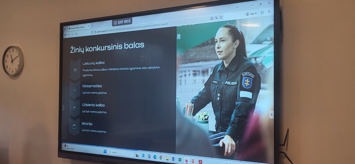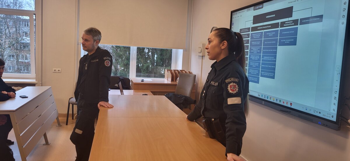 Gruodžio 3 dieną gimnazijoje II-IV klasių mokiniams vyko informatyvi paskaita apie policininko profesiją, kurią vedė Klaipėdos AVPK Klaipėdos miesto policijos komisariato pareigūnai: Kriminalinės policijos Turto tyrimo skyriaus viršininkas Saulius Aleknavičius ir Bendruomenės pareigūnų grupės pareigūnė Simona Narūnė. Paskaitos metu pabrėžta, kad policininko darbas – tai sudėtinga, atsakinga ir kilni profesija, reikalaujanti greitos reakcijos, loginio mąstymo ir puikios fizinės formos. Pareigūnai akcentavo, kad ši profesija siūlo plačias specializacijos galimybes. Išsamiai pristatytas kriminalistų, specialiųjų pajėgų darbas. Paskaitoje be pagražinimų aptarta, kad tarnyba yra kupina iššūkių, o atrankos procesas – griežtas. Buvo pristatytos ir mokymosi galimybės. Ši paskaita sulaukė moksleivių susidomėjimo, netrūko norinčių užduoti klausimus tiesiogiai. Vaikai aktyviai domėjosi realiais pareigūnų darbo pavyzdžiais, stojimo mokytis atrankos niuansais ir karjeros perspektyvomis. Paskaitos pabaigoje pareigūnai negailėjo patarimų moksleiviams, kurie jau dabar svajoja apie tarnybą: rūpintis reputacija, stiprinti kūną ir protą, būti aktyviems, įsitraukti į Policininko rėmėjų gretas. Paskaita neabejotinai sustiprino suvokimą, kad policininko profesija – tai misija, reikalaujanti drąsos, empatijos ir pasiryžimo tarnauti visuomenei.