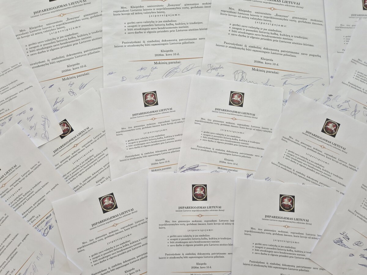 Pasirašyti mokinių įsipareigojimai bus saugomi gimnazijoje – tarsi laiko kapsulė, ateityje priminsianti šios dienos mintis, vertybes ir mokinių pagarbą Lietuvai.